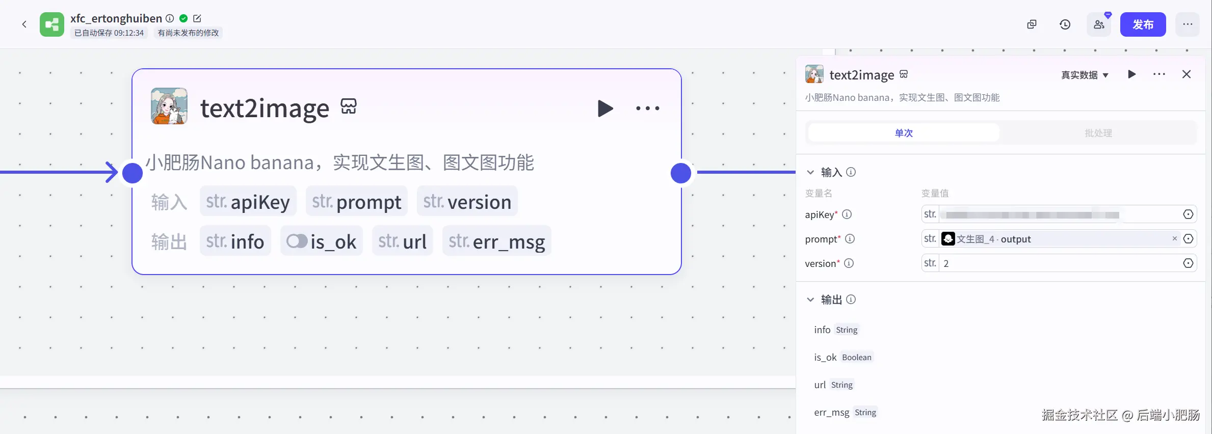 text2image(Nano Banana Pro生图节点): 这个我团队开发的Nano Banana Pro 生图插件,输入apiKey ,propmt选到文生图( 大模型 ) 节点的输出参数,version 填2。