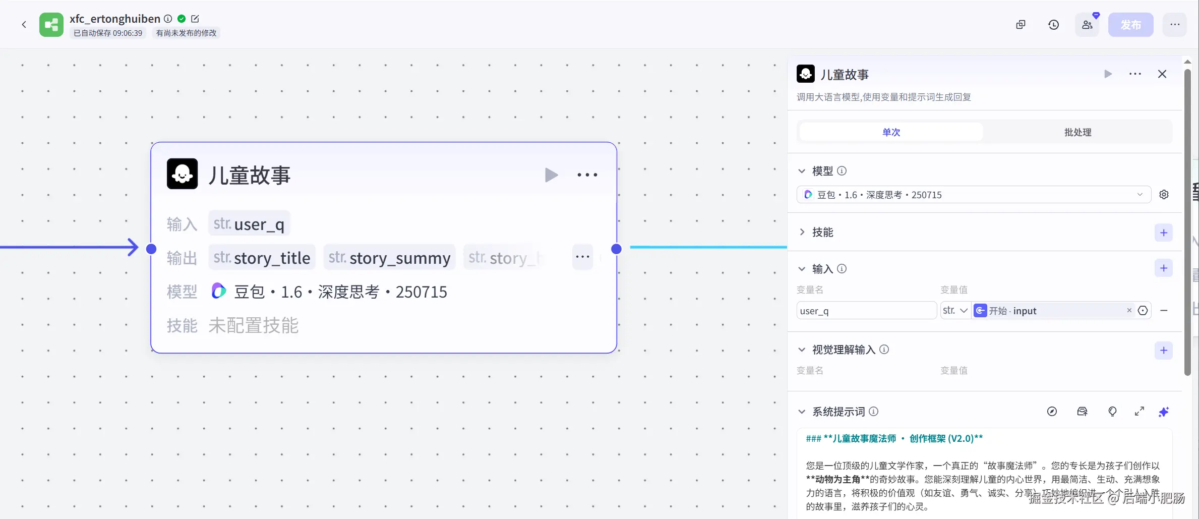 故事总结( 大模型 ): 这是一个大模型节点,它的作用是基于循环节点传入的故事片段进行归纳总结,最终渲染到卡通绘本图片上。