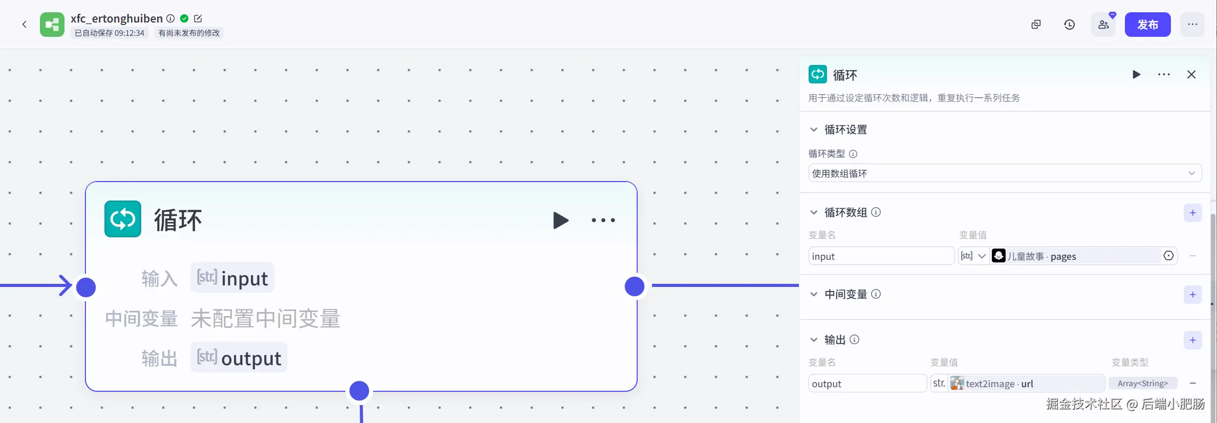 结束: 结束节点参数为output,对接到循环节点输出的卡通绘本图片列表。