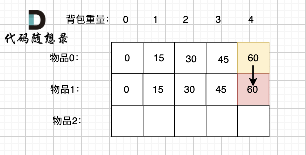 放物品i:背包空出物品i的容量后,背包容量为j - weight[i],dp[i][j - weight[i]] 为背包容量为j - weight[i]且不放物品i的最大价值,那么dp[i][j - weight[i]] + value[i] (物品i的价值),就是背包放物品i得到的最大价值