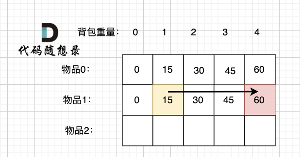 所以 放物品1 的情况 = dp[1][1] + 物品1 的价值,推导方向如图: