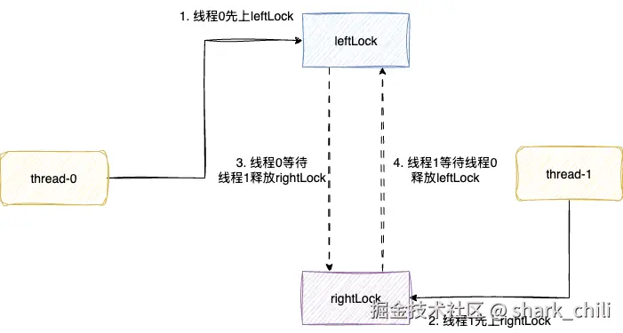 假设线程1执行leftRight对应先拿leftLock再获取rightLock,线程2反之,对应的出现这样一个造成死锁的流程: