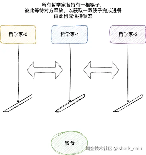 关于死锁,哲学家进餐就是一个非常典型的案例,假设有5个哲学家和5根筷子,每个哲学家必须拿到一双筷子后才能进餐,完成进餐后放下筷子进入思考。我们试想这样一种极端情况,每个哲学家左手都拿一根筷子,都在等待其他人放下一根筷子进餐,由此各自都在等待且不放下彼此手里筷子的过程,就造成了死锁: