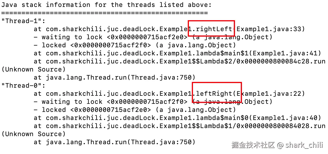 启动后发现两个线程僵持着,笔者基于jstack -b pid定位到了这两个线程的死锁代码段,也就是我们上文的两个函数对应的第二次上锁的位置: