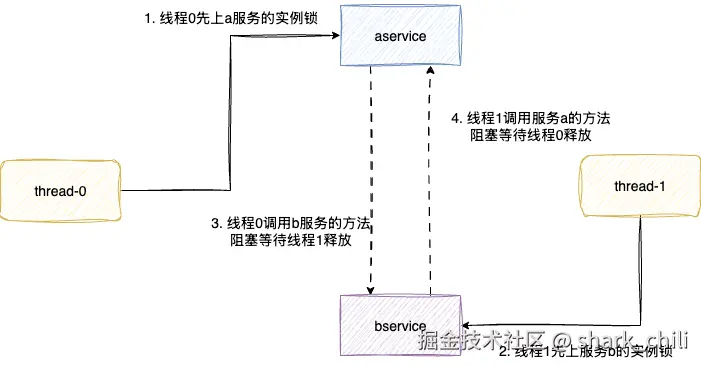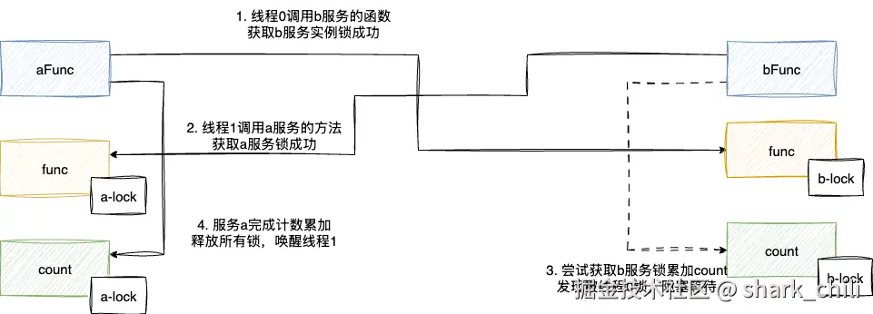 - 线程1尝试调用a服务的func成功,完成后准备上自己的b服务实例锁,发现被线程0持有,阻塞等待
