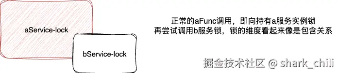 其实仔细审查上述代码之间的调用链,从逻辑分析的角度来看,它不仅仅是一个环路,更像是两把实例锁之间对于彼此使用权的争抢,从调用链路来看,无论是a服务还是b服务,从调用的那一刻起就已经决定整个函数的调用必须是持有一把锁,尝试把另一把锁包在当前实例锁的维度中,也就是这种带有包含关系的锁竞争,最终将平行为度的锁资源竞争变成了各自持有一把锁情况下争抢包含锁的死锁问题: