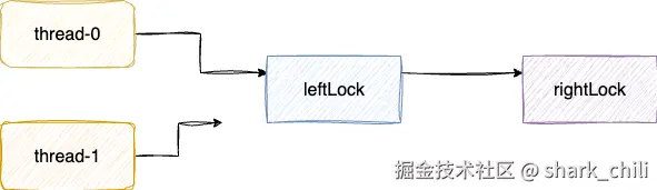 leftLock,发现被线程0持有,陷入阻塞等待 - 彼此僵持构成死锁