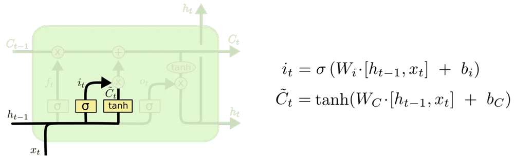 i t = σ ( W h i h t − 1 + W x i x t + b i ) = σ ( W i [ h t − 1 , x t ] + b i ) C t ~ = t a n h ( W C [ h t − 1 , x t ] + b C ) \begin{align} & i_t=\sigma(W{hi} h_{t-1}+W_{xi} x_t+b_i)=\sigma(W_{i} [h_{t-1}, x_t]+b_i) \\ & \widetilde{C_t}=tanh(W_{C} [h_{t-1}, x_t]+b_C) \end{align} it=σ(Whiht−1+Wxixt+bi)=σ(Wi[ht−1,xt]+bi)Ct =tanh(WC[ht−1,xt]+bC)