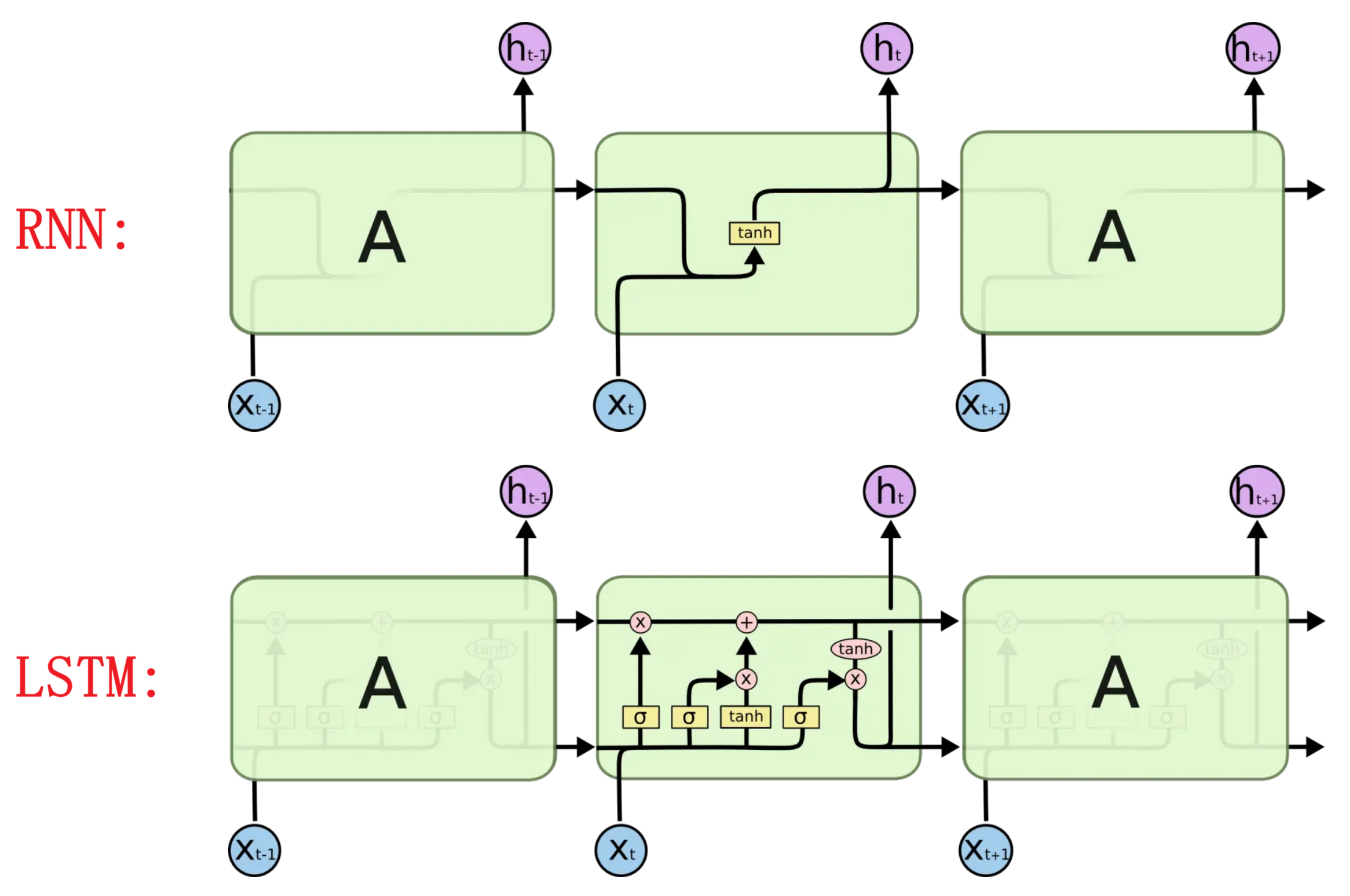 RNN只用了一个tanh, 而lstm有3个sigmoid和1个tanh: