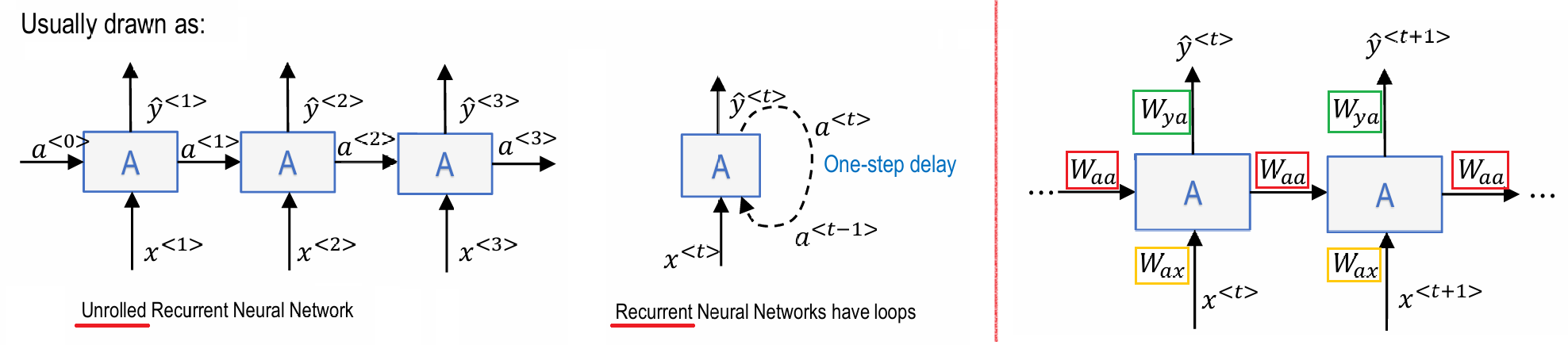 | W a a W_{aa} Waa | 前一隐藏状态 a ⟨ t − 1 ⟩ a^{\langle t-1 \rangle} a⟨t−1⟩ 到当前隐藏状态 a ⟨ t ⟩ a^{\langle t \rangle} a⟨t⟩ 的权重矩阵 |