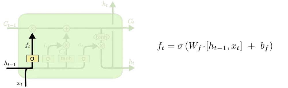 f t = σ ( W h f h t − 1 + W x f x t + b f ) = σ ( W f [ h t − 1 , x t ] + b f ) \begin{align} f_t &=\sigma(W_{hf} h_{t-1}+W_{xf} x_t+b_f) \\ &=\sigma(W_{f} [h_{t-1}, x_t]+b_f) \end{align} ft=σ(Whfht−1+Wxfxt+bf)=σ(Wf[ht−1,xt]+bf)
