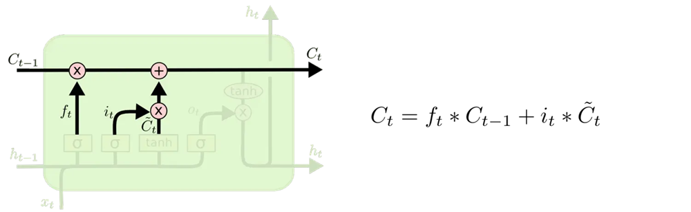 C t = f t ∗ C t − 1 + i t ∗ C t ~ C_t=f_t*C{t-1}+i_t*\widetilde{C_t} Ct=ft∗Ct−1+it∗Ct