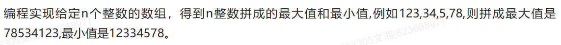 原理是将GetMaxValue函数中的条件运算符的条件改为(*comp)(res1,res2),实际运行时这个地方的函数是根据主函数调用时决定的。主函数调用Compare1选最大值,输出就是最大拼接值,反之就是最小拼接值。