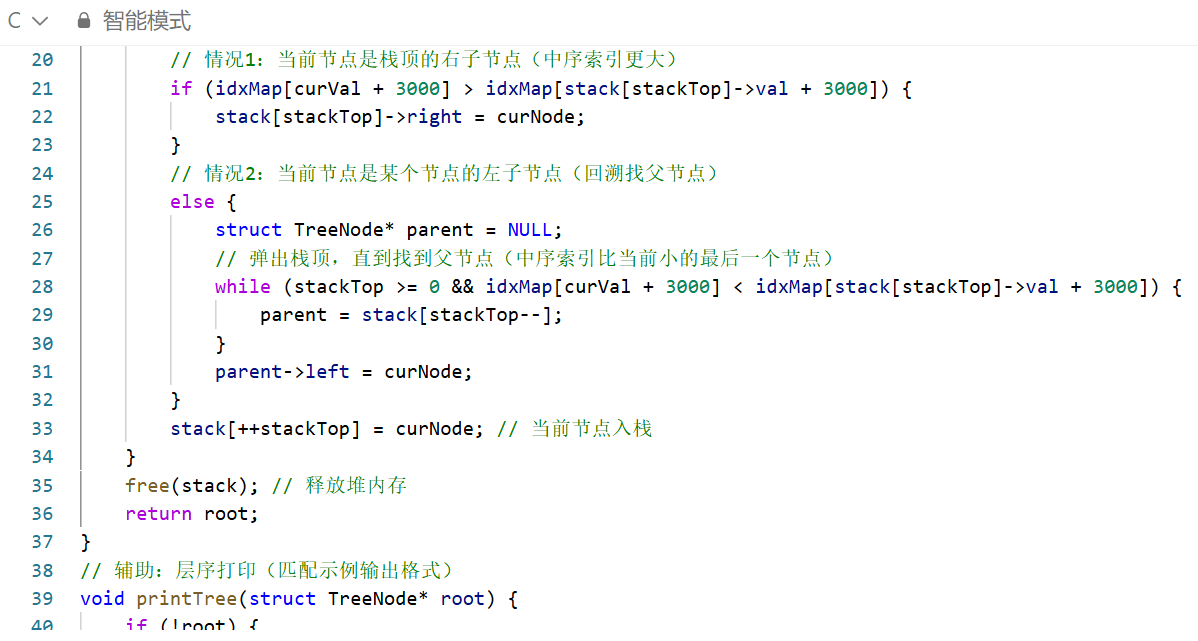 逻辑简洁易理解:核心逻辑集中在一个循环内,无需拆分左右子树范围、传递复杂的递归参数,仅通过中序索引大小即可判断节点的父子关系,直观且不易出错。