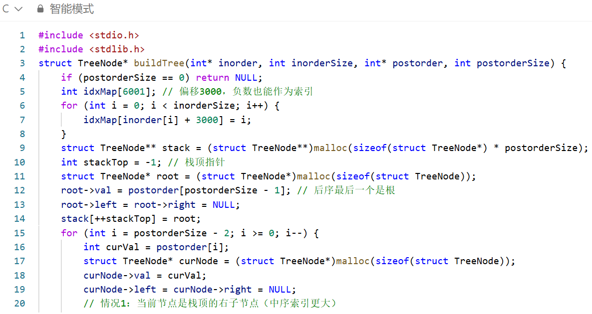 时间效率高:通过数组模拟哈希表(偏移3000处理负数),实现O(1)时间复杂度查找节点在中序数组的索引,相比递归法的线性查找大幅提升效率;整体仅需一次遍历后序数组,时间复杂度为O(n),远优于未优化的递归法(O(n²))。