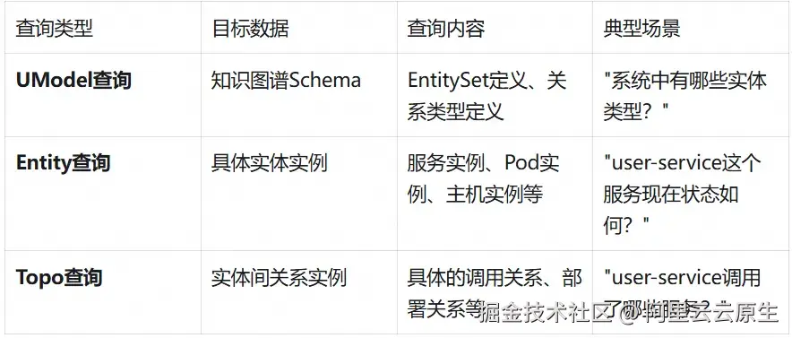 与 UModel 查询关注 Schema 定义不同,Entity 查询专注于运行时实体数据,帮助用户快速定位、检索和分析具体的实体实例,如服务实例、Pod 实例、主机实例等。