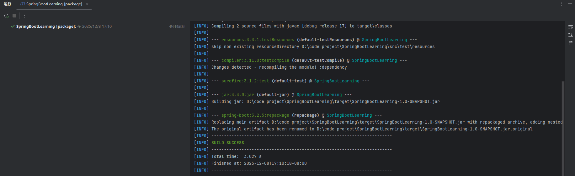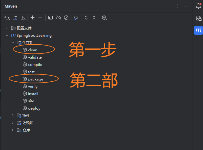 在编译器右边,点击m标识,先点击clean,再进行package;