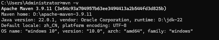 打开命令行,输入mvn -v,如果能正常显示版本信息,则配置成功。