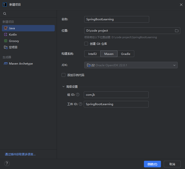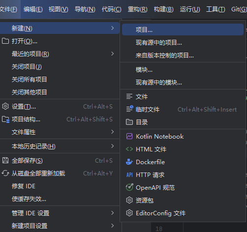 - 1,在`文件`中,选择`新建`--->`项目`,输入项目信息,点击`创建`;