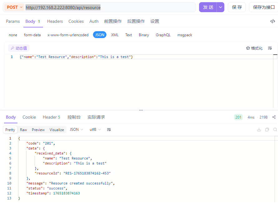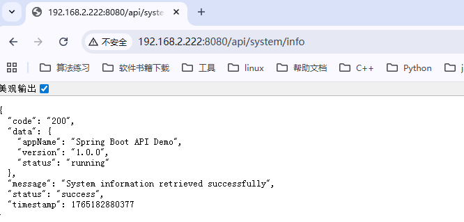 在网址中,输入接口名称http://192.168.2.222:8080/api/system/info,进行get请求,就会显示返回的接口数据;