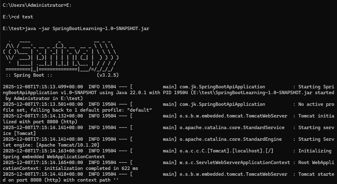 把文件放到自己需要的位置(比如,这里放在E:\test中),打开命令提示符(command + R),输入如下指令,如果成功出现Spring boot的提示信息,则说明程序运行成功!!