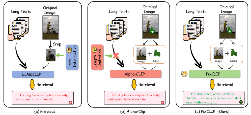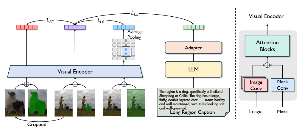 为了协同利用增强视觉和文本内容处理粒度的优势,我们提出了PixCLIP,一个旨在同时容纳视觉提示输入和处理冗长文本描述的新颖框架。