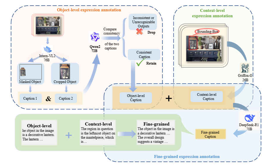 细粒度表达注释:通过DeepSeek-R1-70B整合对向级和上下文级标题,该模型将两种输入合成为统一的细粒度表达。