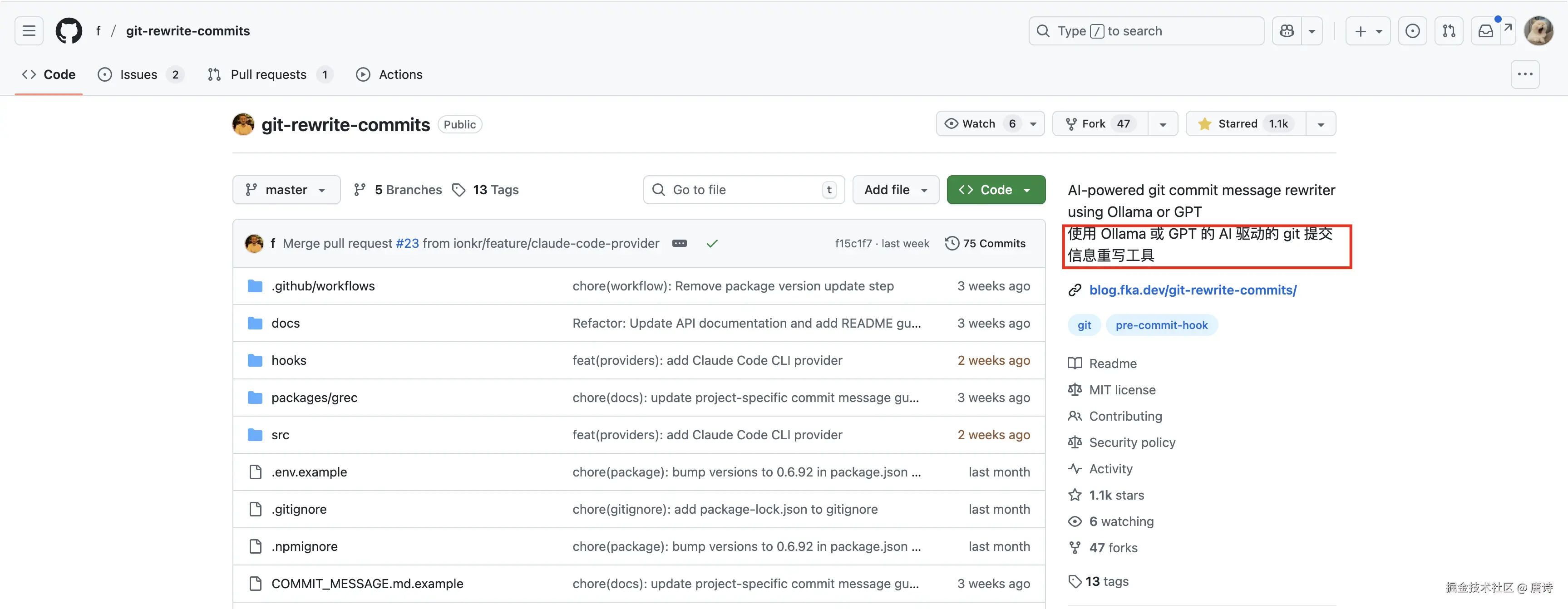 git-rewrite-commits 是一个可以使用 ai 来重写已经提交的 git commit 信息的工具,对于之前项目中 git 提交信息不规范又不想手动去修改时,可以通过一行命令解决,十分方便!