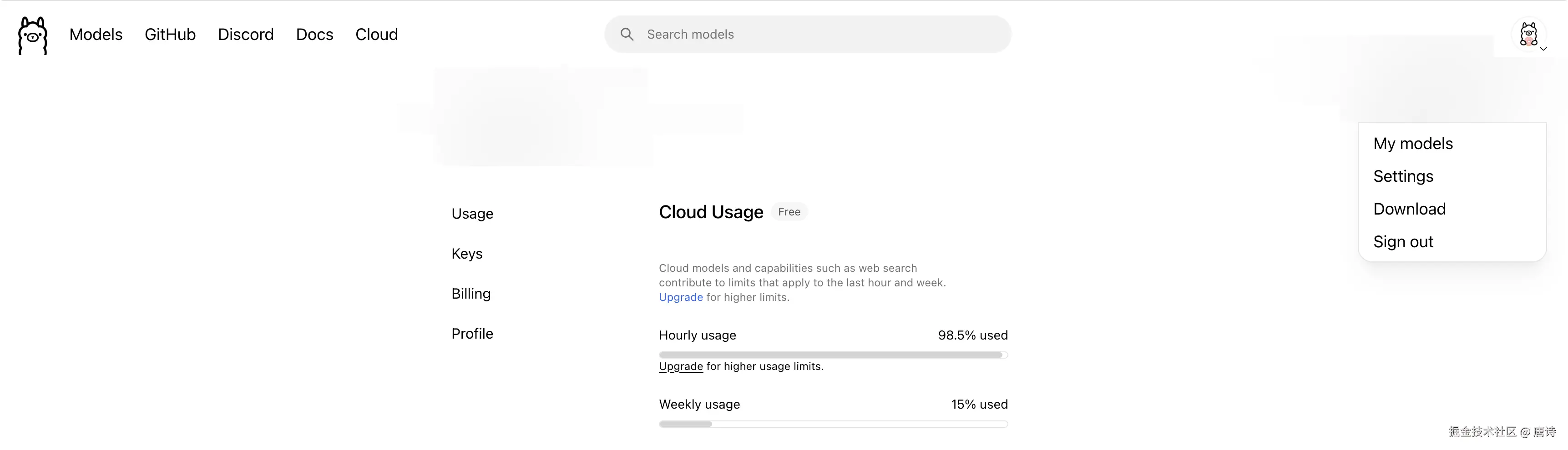 运行云模型需要一个 ollama.com 上的账户,执行 ollama signin 登录或创建账户,登录完成后点击头像->设置,可以看到限额情况