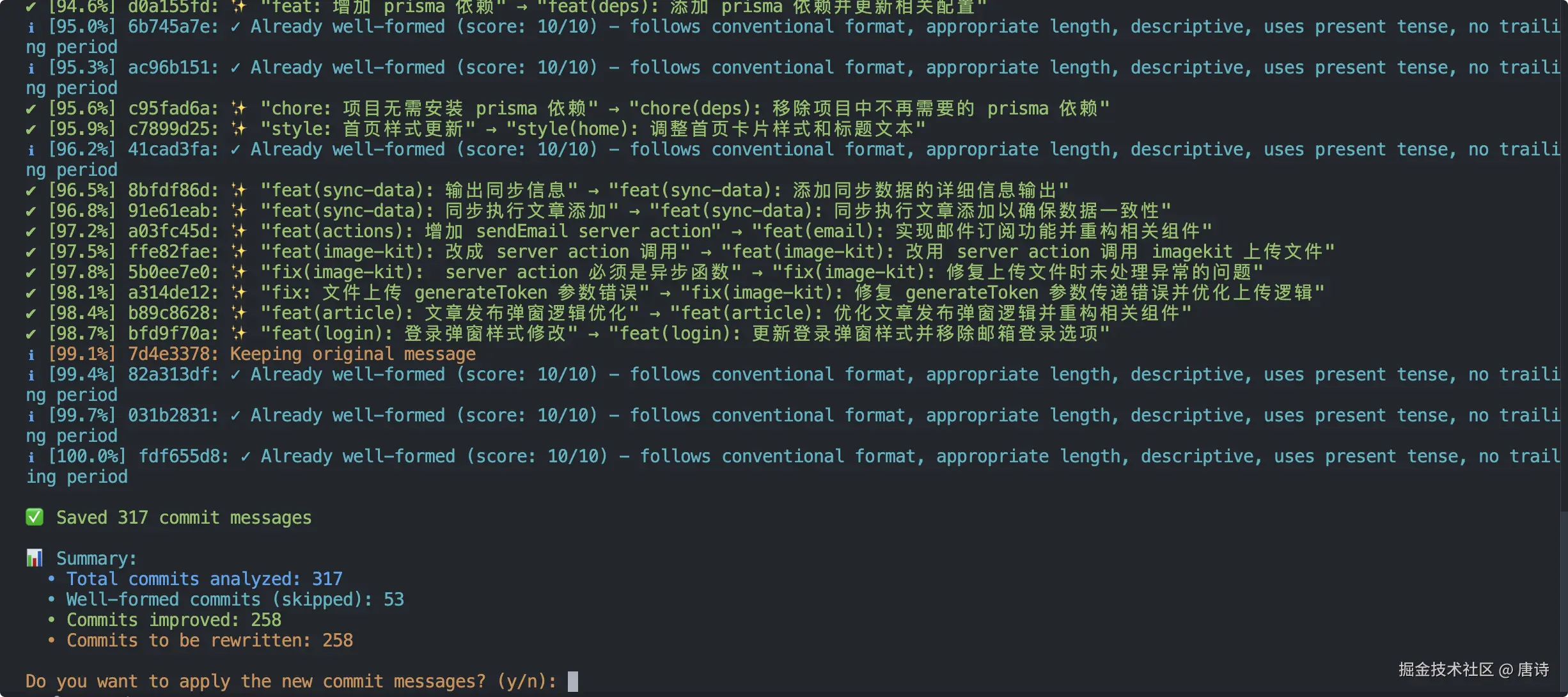 执行结束会让你确认是否重写 git commit 记录,输入 y 确认后开始执行
