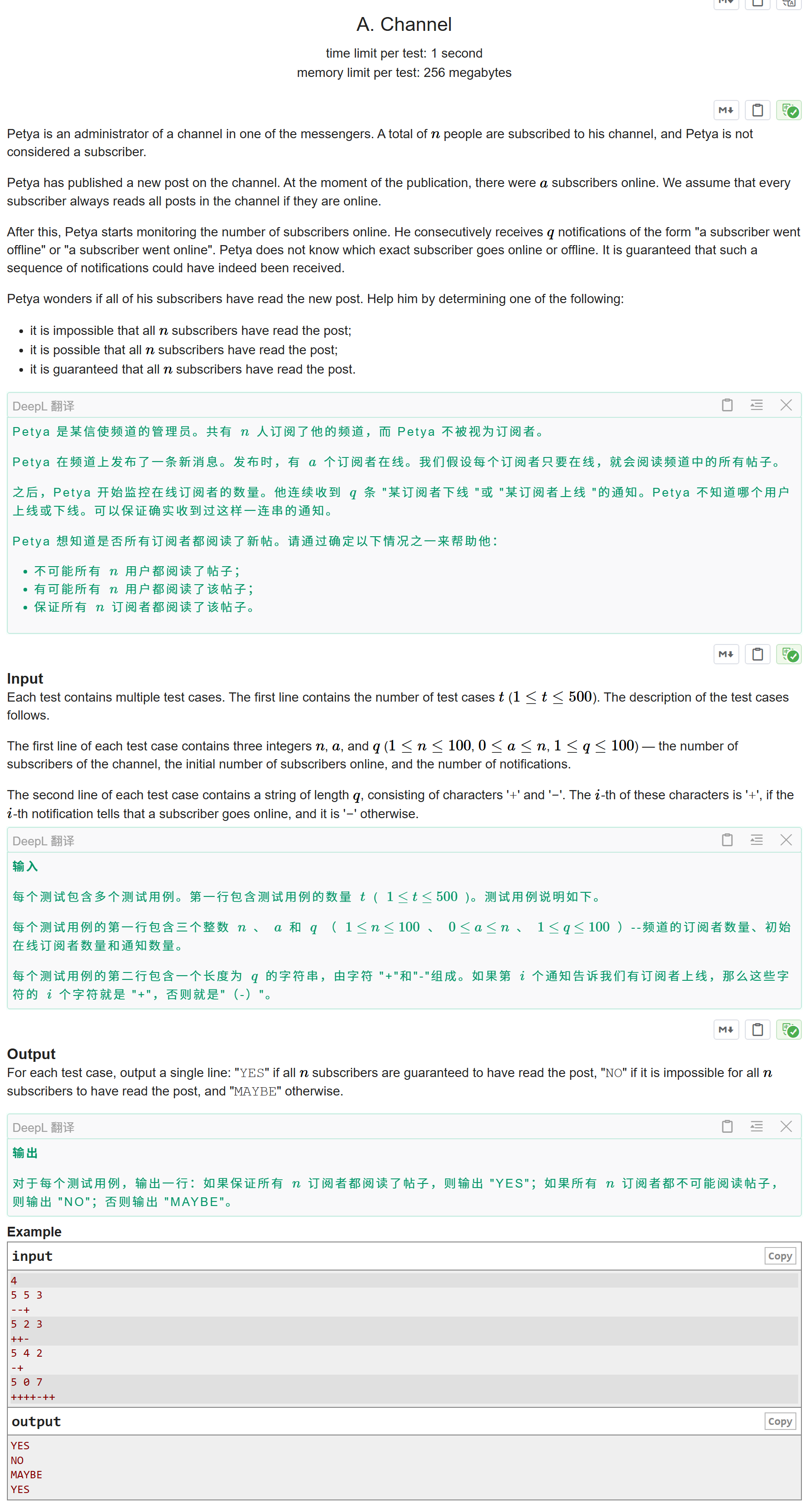 总共有 n 个人,最开始有 a 个人在线上,再给你 q 次消息,每次消息" + "表示上线," - "表示下线,每次上线都会读报,如果一定能够保证 n 个人都度过报输出YES,如果一定不能够保证 n 个人都度过报输出NO,剩下情况输出MAYBE.
