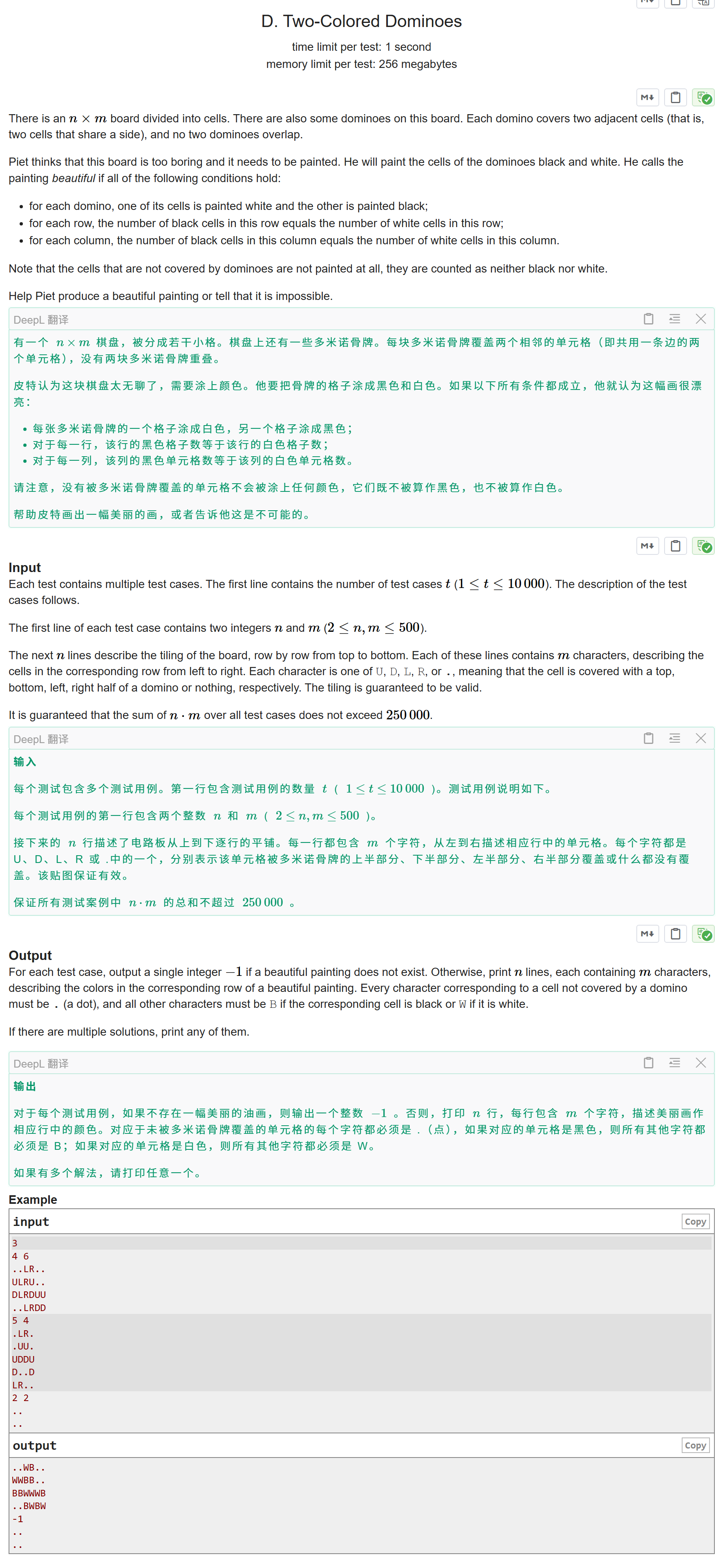 给一个由.LRUD组成的二维数组,问你能否把它在出.的地方图上白色或黑色,使得每一行并且每一列的白色和黑色相等,如果不行输出 -1。