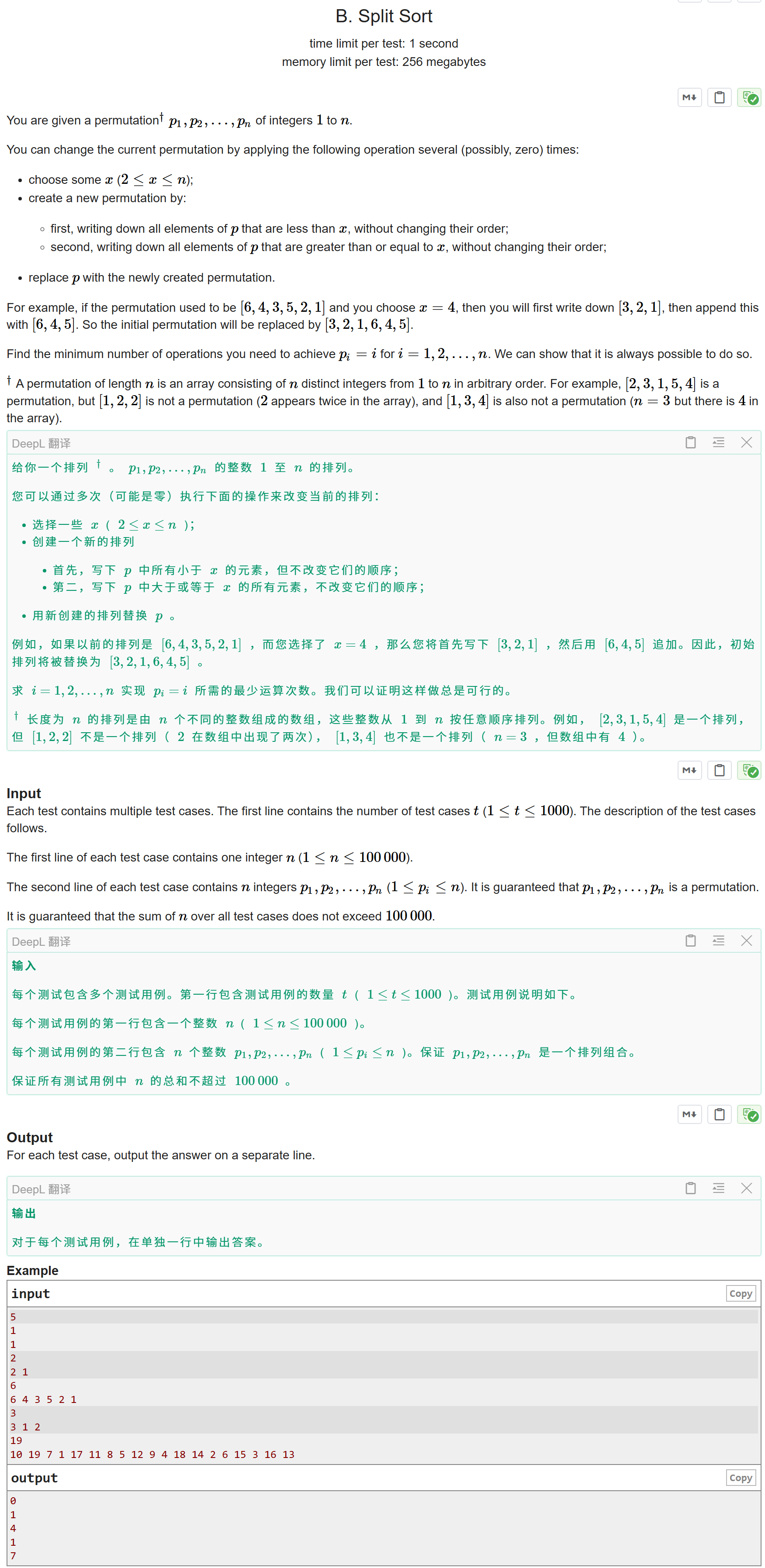 给一个n的排列,问最少通过几次以下操作,将这个排列还原为升序的,操作:选择一些 x (2<=x<=n),创建一个新的排列组合,首先,写下 p 中所有小于 x 的元素,但不改变它们的顺序;第二,写下 p 中大于或等于 x 的所有元素,但不改变它们的顺序,用新创建的排列替换p 。