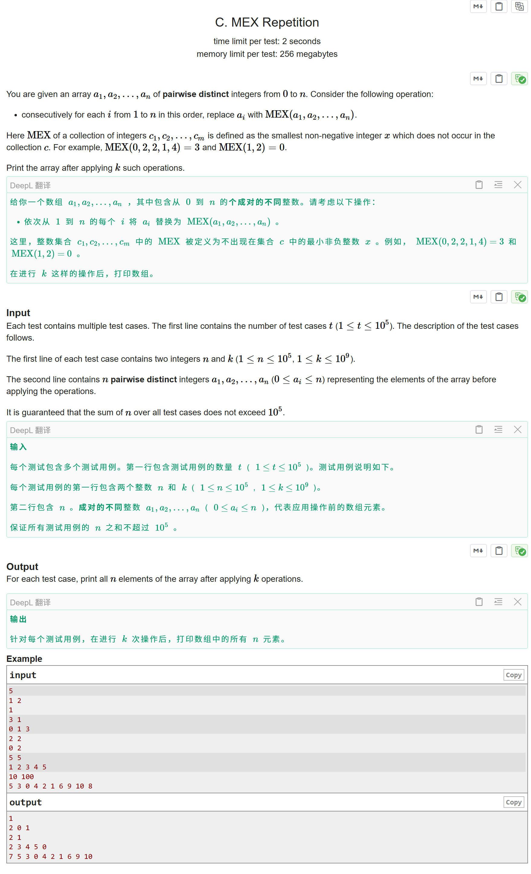 找规律可以发现,经过n+1操作数组又变回原来的样子,所以这是以n+1为周期的循环,而且发现每次操作就是把最后一个数字删除,在数组的首加上MEX(a1,a2,···,an),其实这个值就是上一次被删了的数,所以总的复杂度是O(n),我直接就用vector做的,也可以用双端队列
