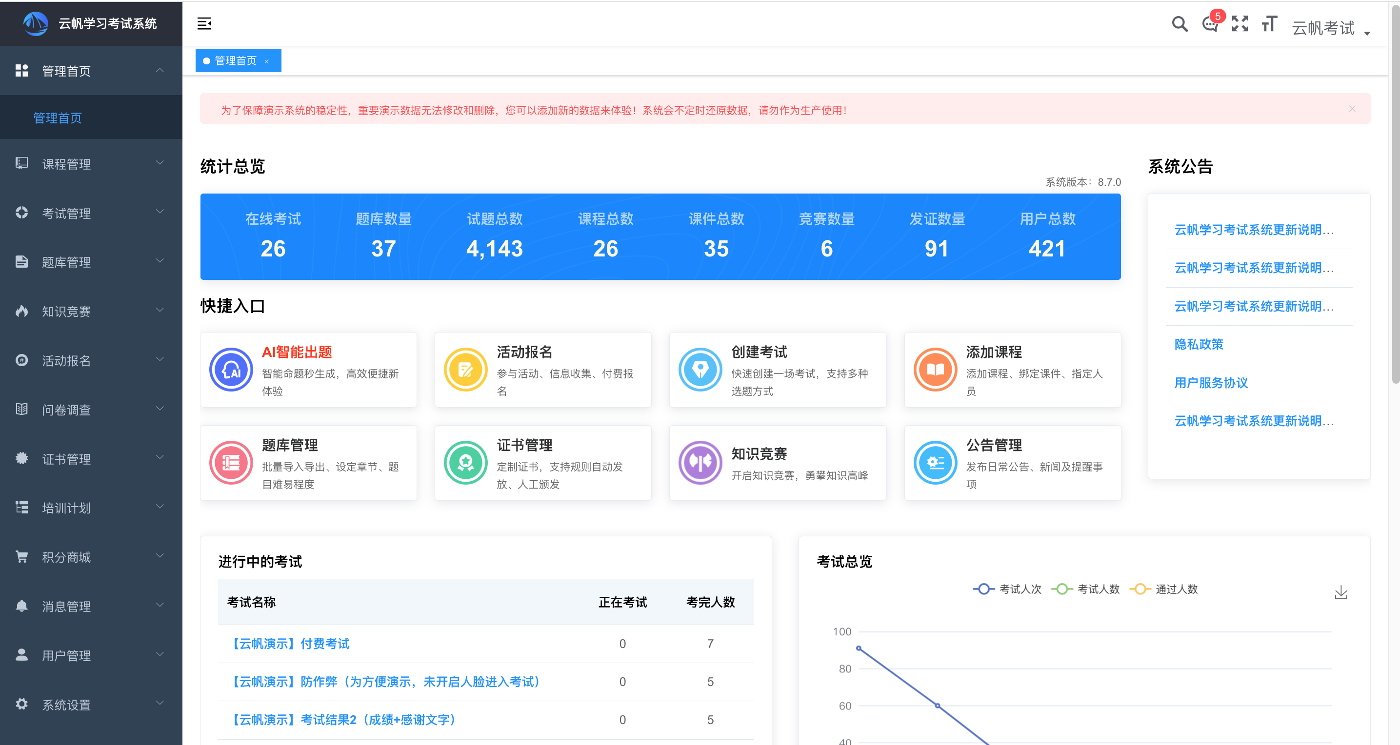 在信息技术应用创新产业蓬勃发展的今天,培训考试系统的全面国产化已成为关乎国家安全和行业发展的战略需求。云帆培训考试系统作为国内领先的国产化培训考试解决方案,凭借其全方位的技术适配能力和完善的安全保障体系,为政企单位、教育机构提供安全可靠、自主可控的数字化人才培养平台。