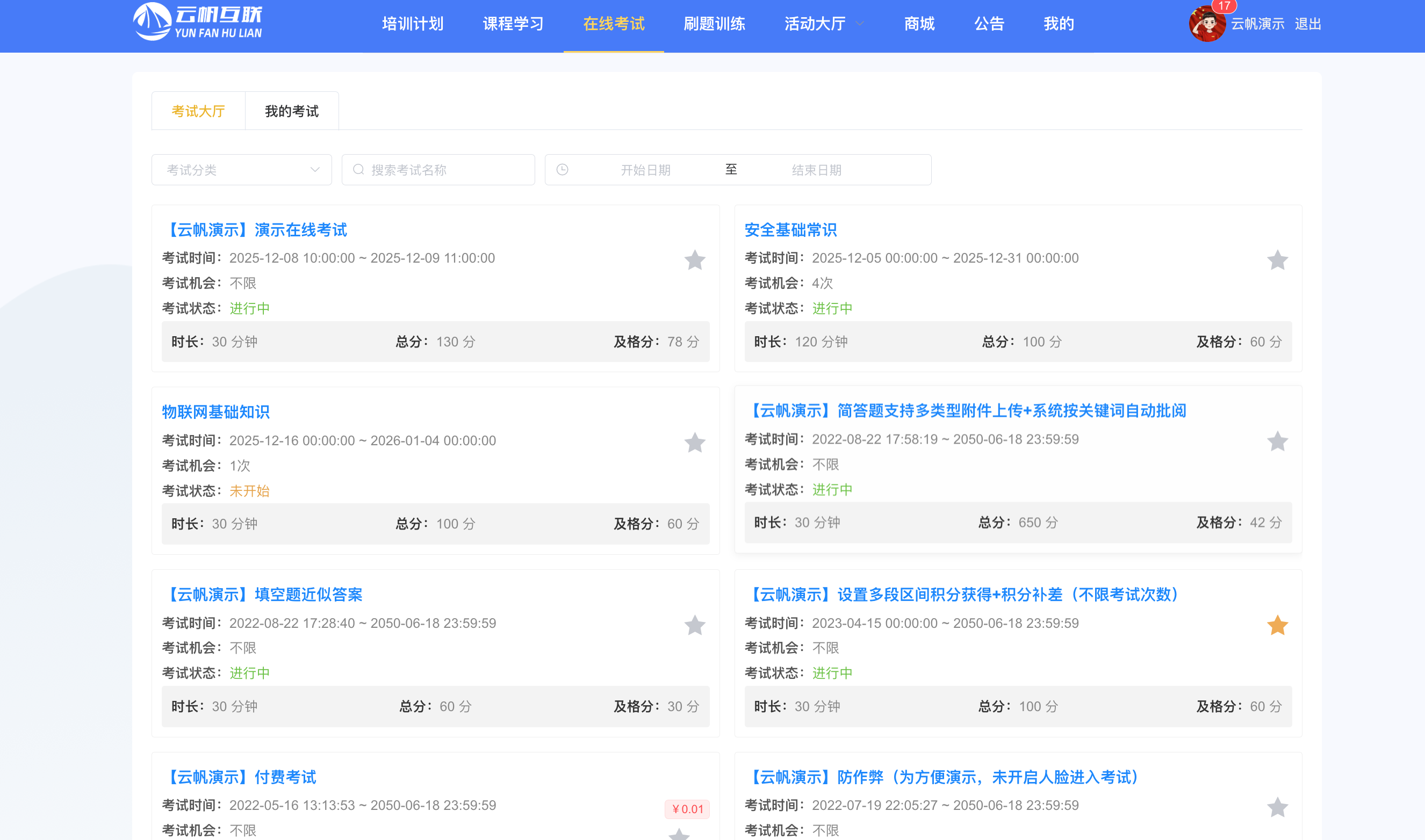 在建设网络强国、数字中国的战略背景下,国产化培训考试系统不仅关乎技术路线的选择,更是保障组织信息安全、掌握数字化发展主动权的关键举措。云帆培训考试系统基于国产基础软硬件环境深度研发,实现了从芯片、操作系统到数据库的全栈适配,为各行业数字化人才培养提供了坚实可靠的技术底座。