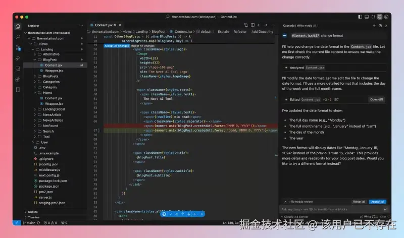 Windsurf 的设计初衷是让开发者维持在心流状态(flow state)。作为一款 AI 原生编辑器,它不仅能在开发者需要时提供代码补全,更通过 Cascade 模式实现了对上下文的深度理解。它能够分析开发者的意图,主动协助重构代码、解释复杂逻辑或生成功能模块。Windsurf 的介入感很低,它不会打断思路,而是让代码编写的过程变得更加连贯和平滑。