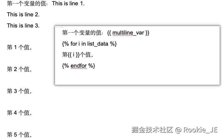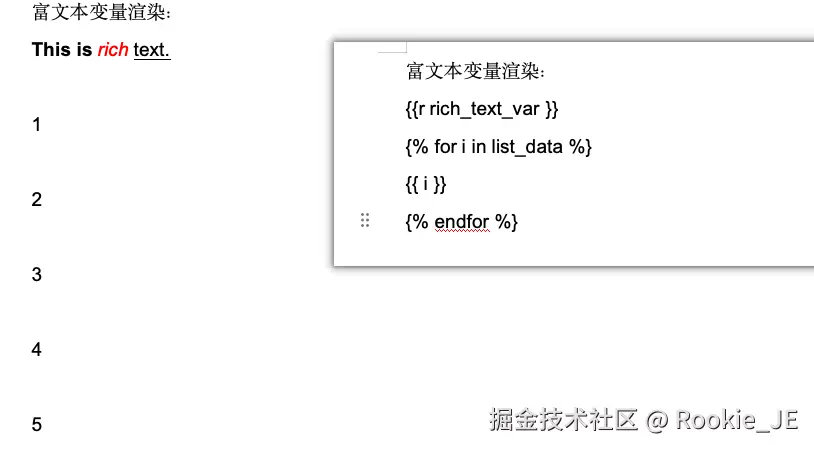 在进行富文本变了渲染的时候,注意使用docxtpl中的RichText库设置富文本,并且在模版中相比普通变量的渲染{{ variable }},需要在模版中添加字母"r" {{r variable }}。