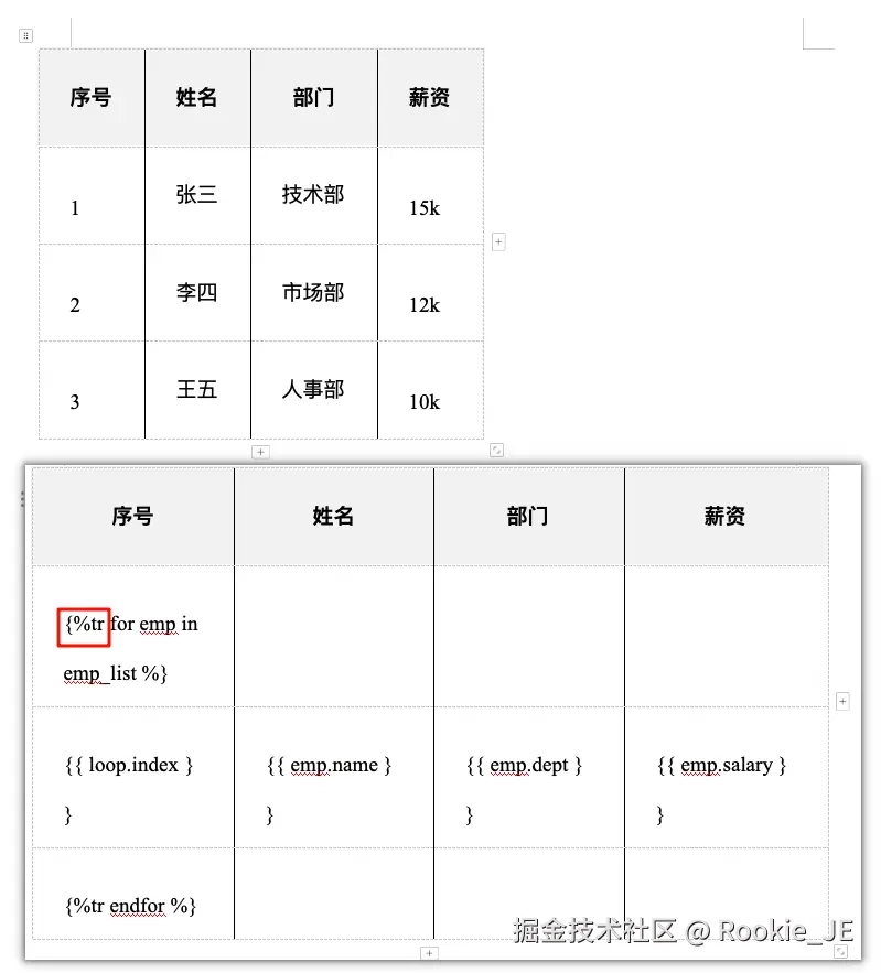 所有 {# ... #} 包裹的内容,在 docxtpl.render() 渲染时会被完全忽略,不会出现在最终的 Word 文档中,p/tr/tc 是人为约定的类型前缀(非 docxtpl 强制语法),目的是让模板开发者快速识别注释对应的 Word 元素(比如看到 {#tr ...#} 就知道这是针对表格行的注释)。