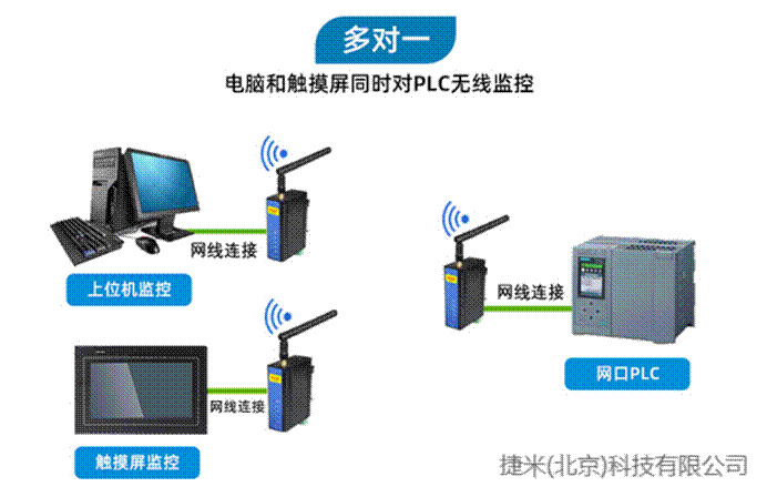 核心诉求:需将 5 台 PLC 的实时运行数据(设备启停状态、生产产量计数、电机运行电流、故障报警代码等)集中采集至中控室 1 台工业触摸屏,实现生产状态可视化监控与远程指令下发;要求摒弃传统有线布线方式,降低长距离施工成本与后期维护难度,同时保障数据传输稳定可靠,适配厂房多电机、多变频器的复杂电磁环境。