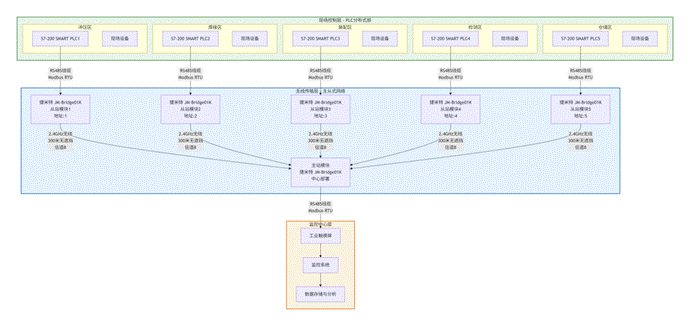 某汽车零部件制造厂房内,5 台 PLC 设备(型号:西门子S7-200 SMART)分别部署于冲压、焊接、装配、检测、仓储 5 个关键生产区域,设备间距 30-80 米,整体覆盖范围达 300 米,现场无高大设备、墙体等遮挡物,无线信号传输路径通畅。