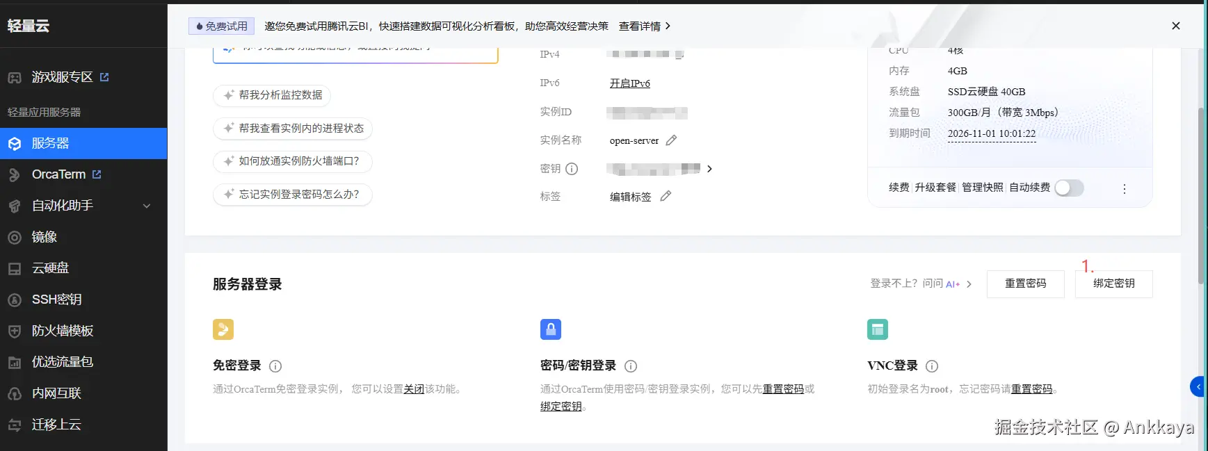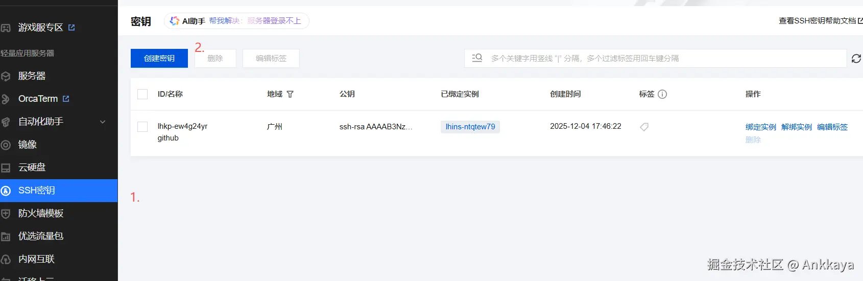 进入服务器详情,绑定密钥,选择已经添加的密钥