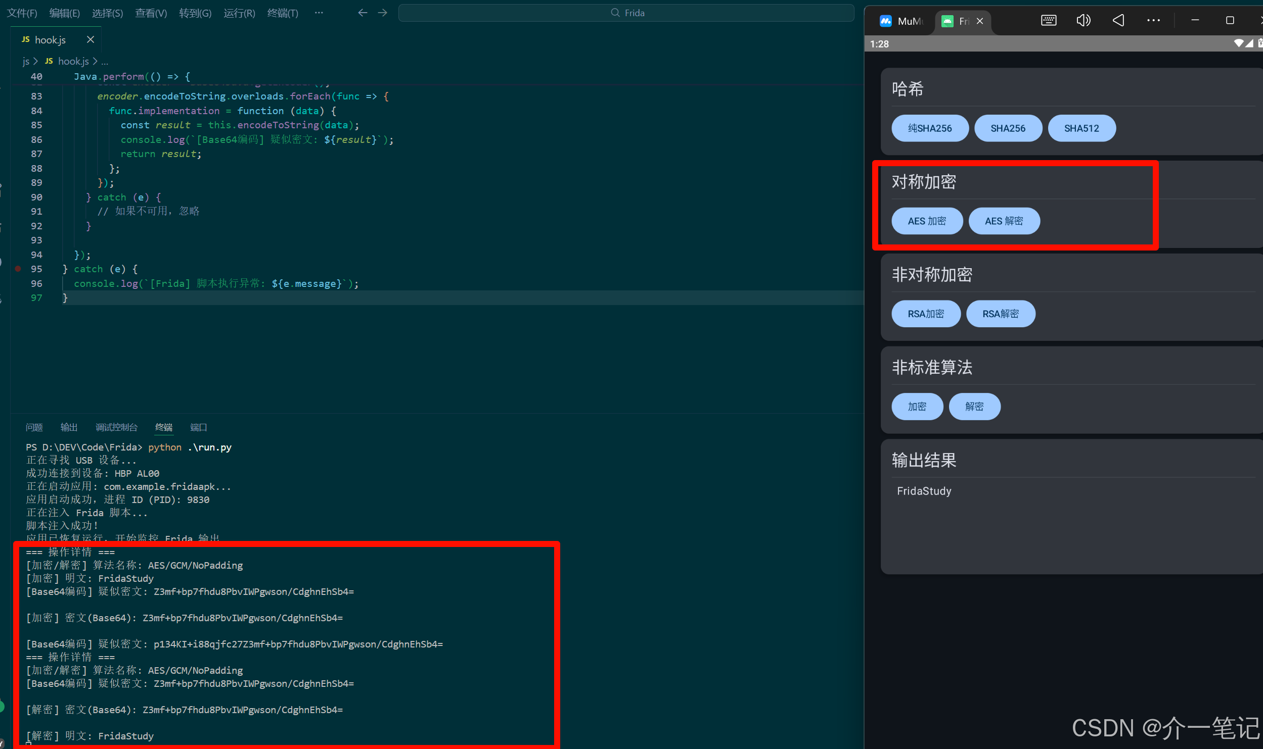 运行启动脚本后,操作示例 APK 的对称加密区域,输出结果如下:
