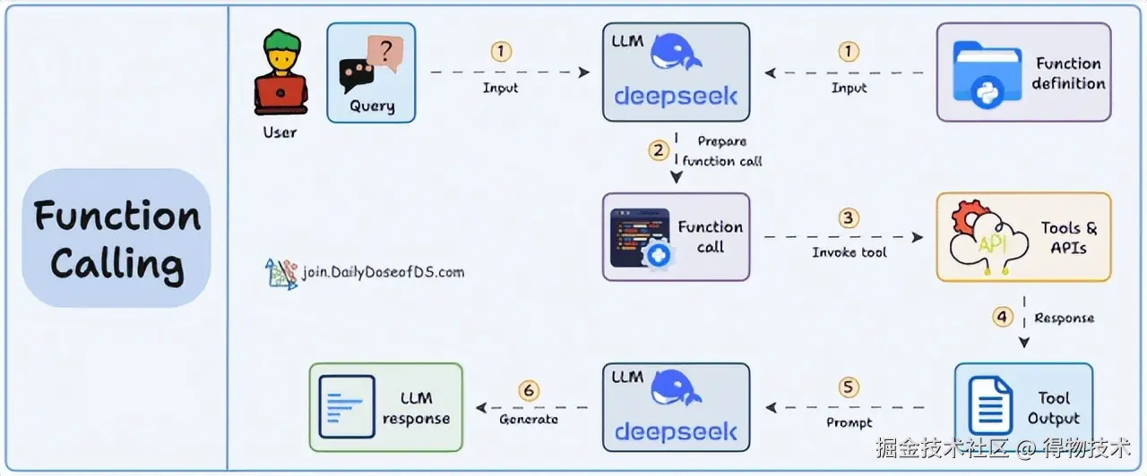 而Function Calling(函数调用) 拓展了模型执行动作的能力,解决纯文本交互的局限性,即模型解析用户意图后生成结构化指令,调用预定义外部函数或 API(如发送邮件、查询天气)。其工作原理为 :当用户发出提问时,应用会将集成的函数列表作为上下文发送给大模型。大模型根据用户输入判断应调用的函数,并生成相应的调用参数。随后,应用执行该函数并将结果发送给大模型,作为补充信息供其生成最终的总结或回答。技术流程:用户指令→ 模型识别需调用的函数→ 生成参数化调用指令→ 外部系统执行→ 返回结果至模型→ 生成用户响应。