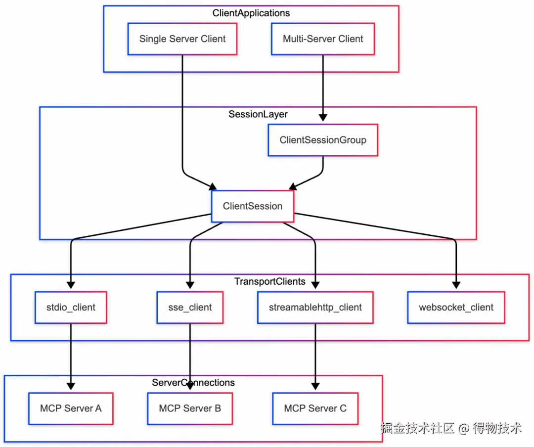 了解完其在生态中所处的位置后,本节将结合 Python 版 SDK 源码和开源 MCP for DB 项目解读如何运用 MCP 以此了解其架构原理及使用方法。MCP Python SDK 提供了一个分层架构,通过多种传输协议将 LLM 应用程序连接到 MCP 服务器,同时具有高级和低级开发 API。