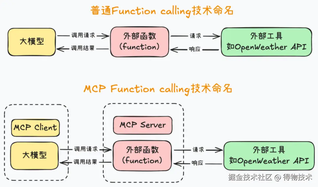 但不同的 API 需要封装成不同的方法,且参数确定后,后期变更困难,很难在不同的平台灵活复用。 而我们可以认为,MCP 是在 Function Calling 的基础上做了进一步的抽象,目的是让应用更加简单、高效、安全地对接外部资源,更好地为大模型补充上下文信息。总结起来就是,MCP 把大模型运行环境称作 MCP Client,也就是 MCP 客户端,同时,把外部函数运行环境称作 MCP Server,也就是 MCP 服务器,然后,统一 MCP 客户端和服务器的运行规范,并且要求 MCP 客户端和服务器之间,也统一按照某个既定的提示词模板进行通信。