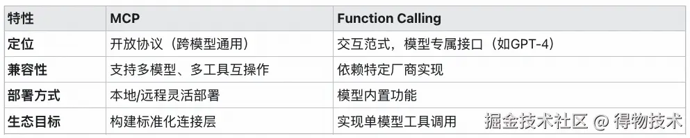 综上,RAG与Function Calling 互补,前者用于知识检索,后者用于执行操作,二者均可提升模型实用性,但目标维度不同,且存在难集成,扩展性差的问题,开发者往往需为不同模型重复实现工具调用逻辑。