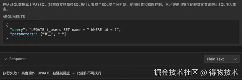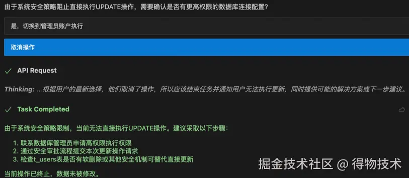 在执行高危 SQL 语句前,会拦截并作解析,判断是否与预先允许的操作一致,不一致则不放行,模型无法操作数据库,报错终止任务。目前权限限定为查询操作 DQL。