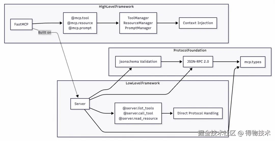 MCP Server作为 MCP 架构的核心部分,在提升AI应用性能方面发挥着不可替代的关键作用。其 Python 版 SDK 提供的框架图如下: