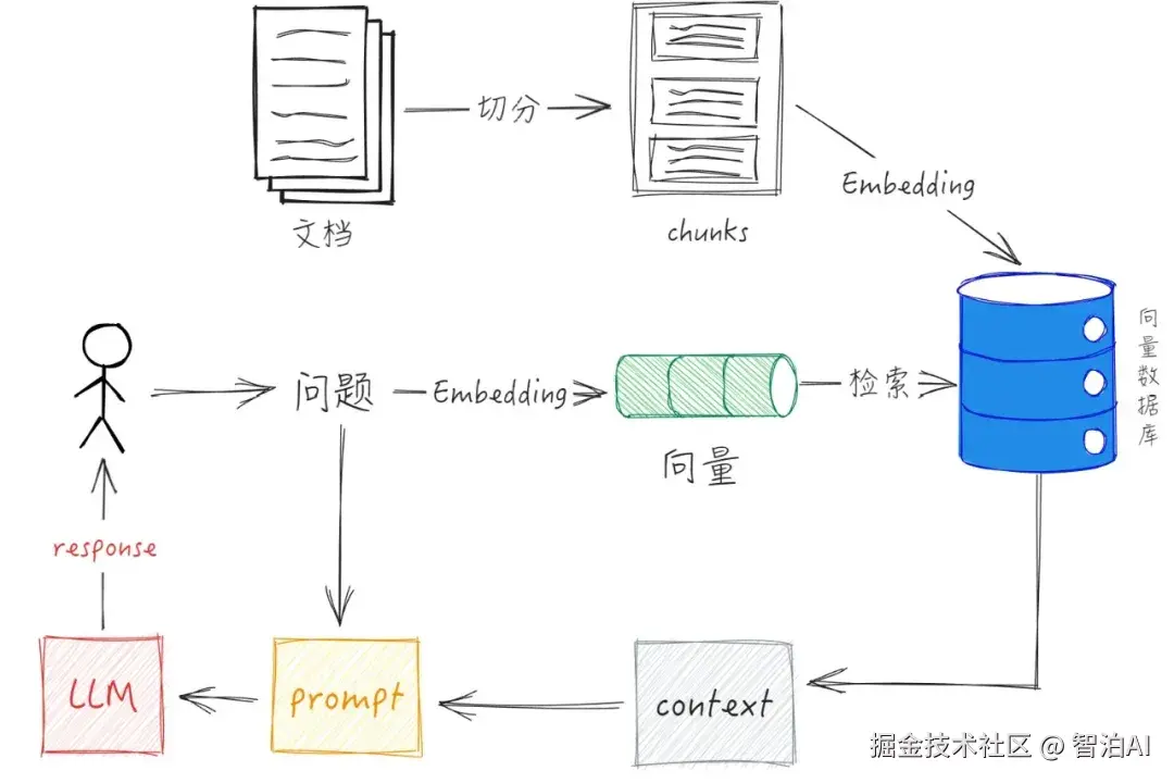 基础RAG架构的流程设计极为简洁,其核心特征在于数据流的单向性。这种架构的快速部署优势显著,但距离生产级应用仍存在差距。